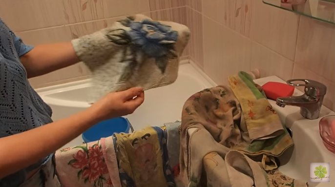 5 ლიტრ მდუღარე წყალში ჩაასხით 1 ს.კ მცენარეული ზეთი, ამავე რაოდენობით გამათეთრებელი ფხვნილი, ნახევარი ჭიქა ნებისმიერი სარეცხი ფხვნილი და 30 გრამი სოდა. კარგად გადაურიეთ. მიღებულ ნარევში მოათავსეთ თეთრი პირსახოცები მთელი ღამით, ხოლო დილით, გაღვიძებისთანავე გარეცხეთ ისინი სარეცხ მანქანაში ჩვეულებისამებრ.
