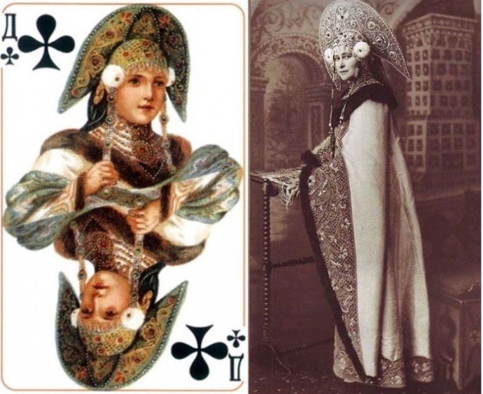 კარტების გამოსახულება შეიქმნა ''კოსტუმირებული ბალის ალბომში'' არსებული სურათების მიხედვით. მეფეების, ვალეტებისა და დედოფლების კოსტიუმები სათამაშო კარტში ზუსტად იმეორებს ბალ-მასკარადის მონაწილეების კოსტიუმებს. ტუზებზე გამოსახულია ფარები, უძველესი რუსული იარაღი და აღჭურვილობა.