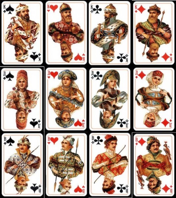 ერთი შეხედვით ამ დასტაში განსაკუთრებული არაფერია, თუმცა ის საინტერესო ისტორიის მატარებელია. ყურადღება მიაქციეთ ბანქოზე დახატული გმირების ჩაცმულობას: მეფეებისა და დედოფლების პროტოტიპებად გამოყენებული არა პროლეტარები და კოლმეურნეები, არამედ 1903 წელს რომანოვების სასახლეში გამართული უკანასგნელი კოსტუმირებული ბალის მონაწილეები არიან.