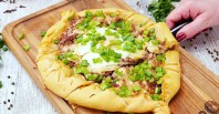 - ფრთხილად შეახვიეთ ცომი. დარწმუნდით, რომ მასში ხვრელები არ დარჩა - სოუსის გამოდინების ასარიდებლად. დაამრგვალეთ და გაახვიეთ ფქვილში.
