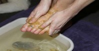 დაიდეთ გახეხილი კარტოფილი ფეხებზე და გადაიხვიეთ საკვების პლიონკით. გაიჩერეთ ის დაახლოებით 30 წუთით და შემდეგ დაიბანეთ ფეხები ცივი წყლით.