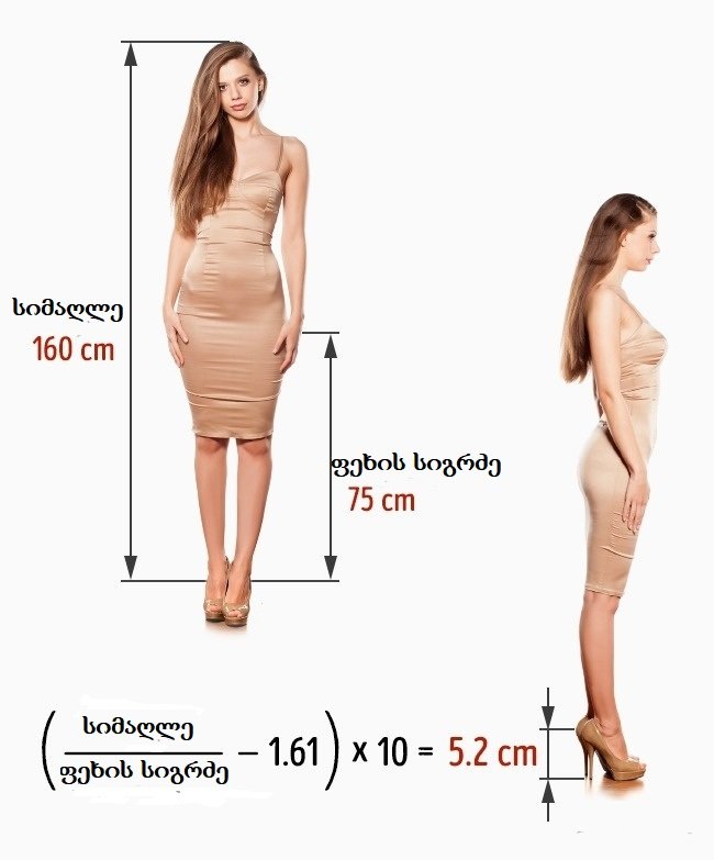 ფორმულის არსი იმაში მდგომარეობს, რომ იდეალური ქუსლი - ფეხების სიგრძის ”დანამატია”, რათა ფეხების სიგრძისა და სიმაღლის იდეალური შეთავსება - 1,61 იყოს.