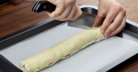 - წაუსვით ყველის გულსართი და ცელოფნის მეშვეობით ფრთხილად გადაახვიეთ რულეტად.