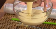 - მიღებული ნარევი მოათავსეთ პატარა ზომის ქვაბში, ჩაამატეთ ქოქსის რძე და ზეითუნის ზეთი. მუდმივი მორევის პირობებში გააცხელეთ ნარევი, თუმცა არ მიიყვანოთ დუღილამდე.