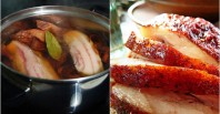 - აადუღეთ ქვაბში ლიტრა წყალი, ჩააყარეთ წიწაკა, მარილი, შაქარი და დაფნის ფოთოლი - წამოადუღეთ 5 წუთი, ჩადეთ ხორცი მარინადში, დააცადეთ სანამ სულ არ გაცივდება, დატოვეთ პრესის ქვეშ 12 საათით.